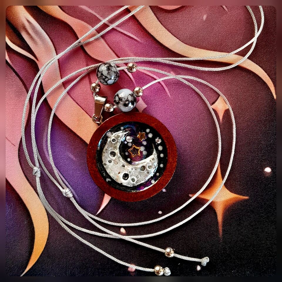 Polymer clay Hand sculpted Moon is floating in a resin galaxy, lightweight & on an adjustable colorful beaded cord or chain at your request.