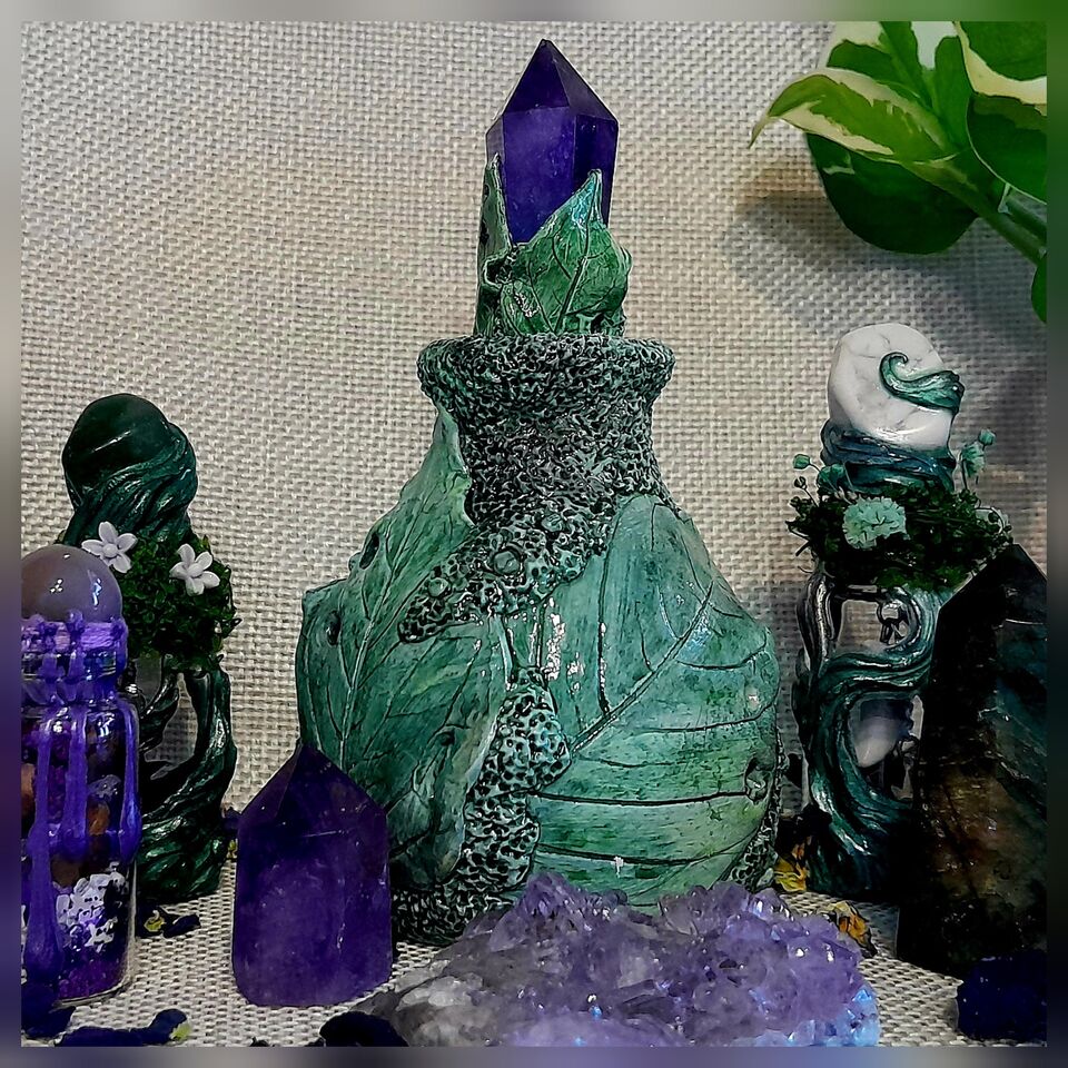 Hand sculpted polymer clay around a useable ceramic vase, topped with a beautiful deep purple amethyst point, an earthy addition for that witchy vibe.