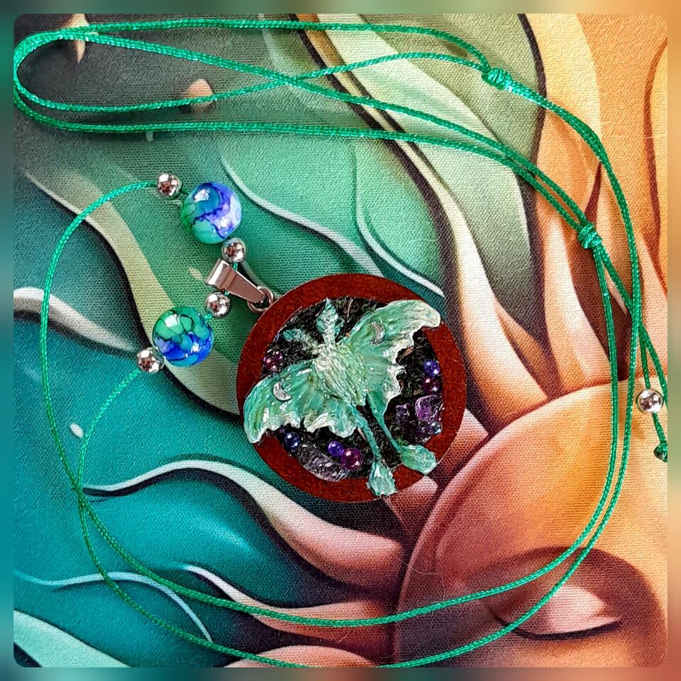 Polymer clay Hand sculpted Luna Moth on a bed of faux moss, Amethyst & iridescent beads on a wood base, lightweight & on an adjustable colorful beaded cord or chain at your request.