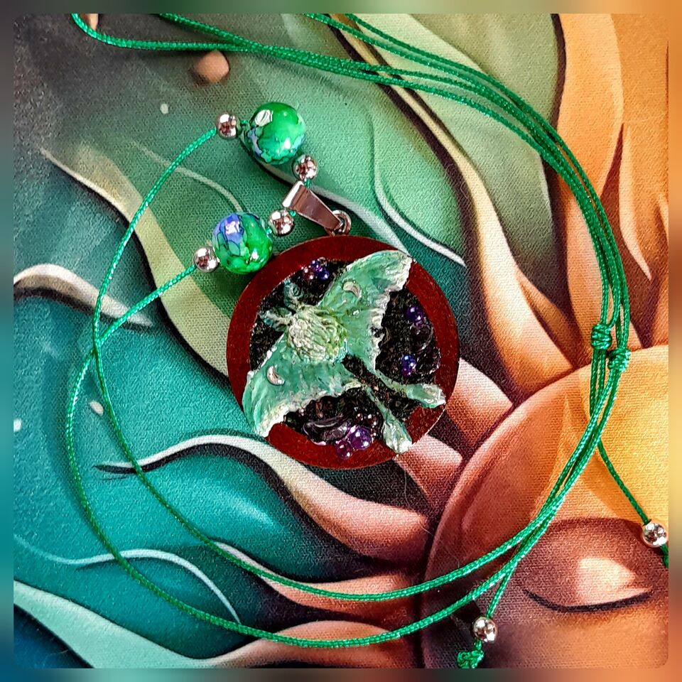 Polymer clay Hand sculpted Luna Moth on a bed of faux moss, Amethyst & iridescent beads on a wood base, lightweight & on an adjustable colorful beaded cord or chain at your request.