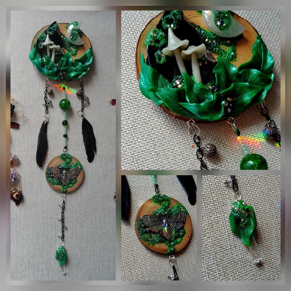 Shes approximately 40cm long, beautiful from top to bottom with Black Agate & Quartz Aura Moon, glowing hand sculpted Mushrooms & shimmering embellishments.