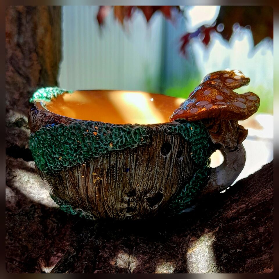 A thrifted tiny ceramic teacup has been transformed with polymer clay to this magical little treasure. Perfect for some fairy themed decor.