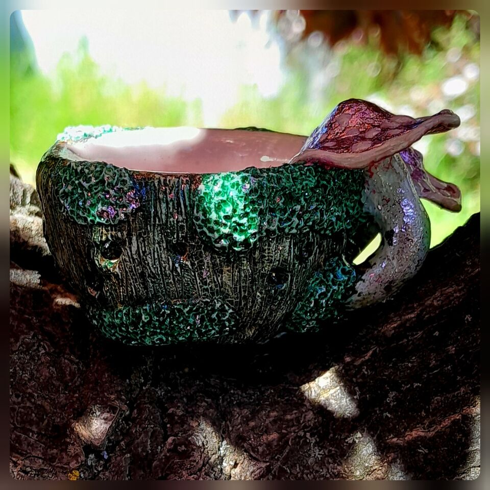 A thrifted tiny ceramic teacup has been transformed with polymer clay to this magical little treasure. Perfect for some fairy themed decor.