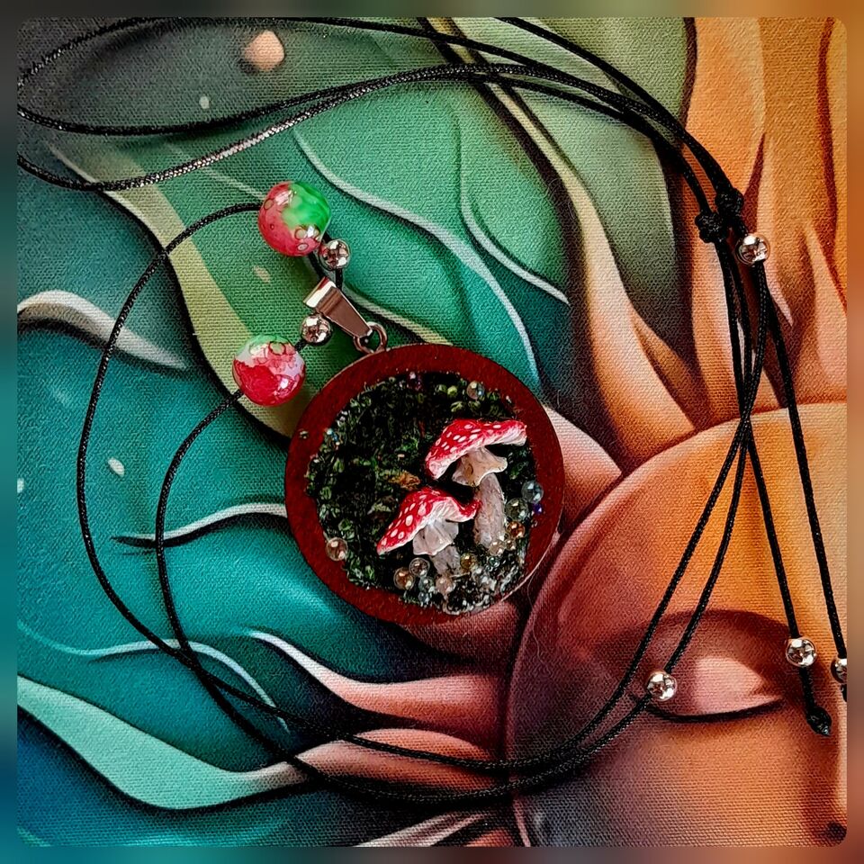Polymer clay Hand sculpted Mushrooms on a bed of faux moss with pretty iridescent beads on a wood base, lightweight & on an adjustable colorful beaded cord or chain at your request.